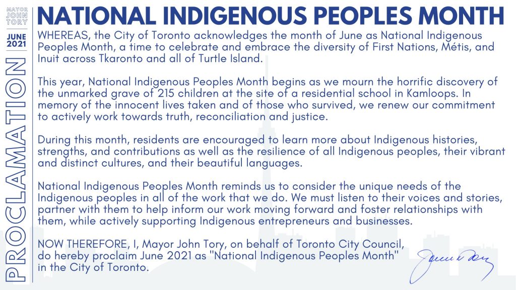 Mayor Tory Proclaims National Indigenous Heritage Month