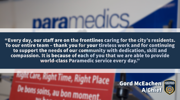 This week, we celebrated Paramedic Services Week in Canada and highlighted the amazing work of our staff on Twitter and Facebook. There were also daily prize giveaways donated by the TPS Care Fund and by TCEU Local 416 (winners are listed on the TPS Staff Blog). We are honoured to work alongside each of you and thank you for your commitment to serving our communities.